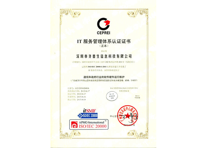 ISO/IEC 20000 IT服務(wù)管理體系認(rèn)證證書